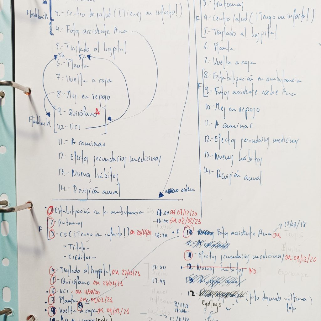 Así que necesitaba crear un guion. Quienes asistieron a las presentaciones del libro tuvieron la oportunidad de ver la libreta donde fui planificando a medida que desarrollaba el libro todos los aspectos del mismo, Digo que iba porque aquello cambiaba de un día para otro, era el libro quien me llevaba a mí y me hacía acoger ideas y abandonar otras. En la fotografía se puede ver el guion y sus cambios.