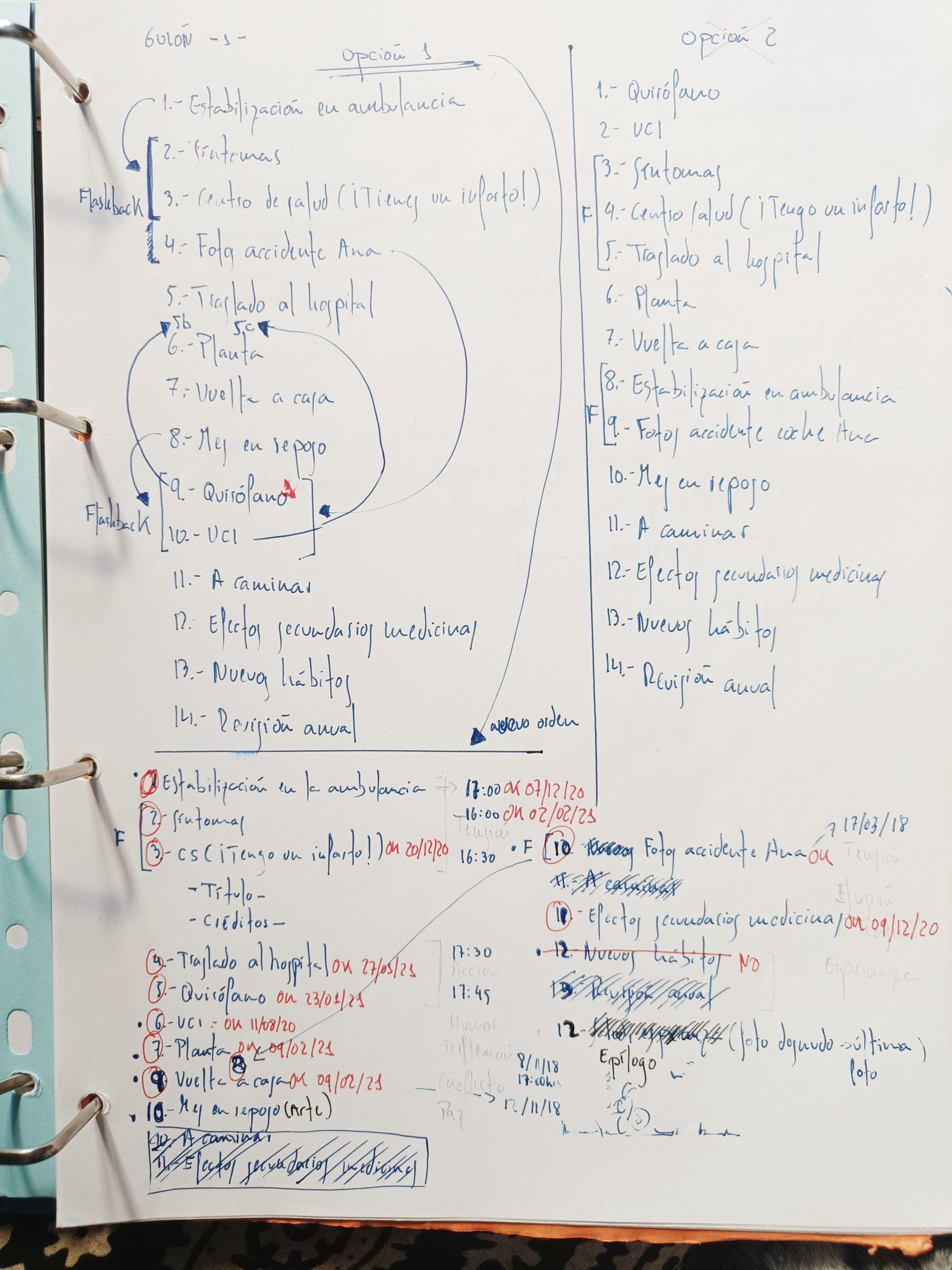 Así que necesitaba crear un guion. Quienes asistieron a las presentaciones del libro tuvieron la oportunidad de ver la libreta donde fui planificando a medida que desarrollaba el libro todos los aspectos del mismo, Digo que iba porque aquello cambiaba de un día para otro, era el libro quien me llevaba a mí y me hacía acoger ideas y abandonar otras. En la fotografía se puede ver el guion y sus cambios.