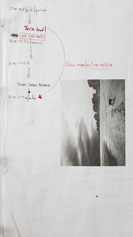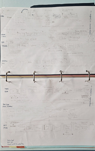 Un año de desarrollo da para mucho pensar, para reafirmarse en ideas previas o terminar por rechazarlas, abrazar las que vienen. Todo eso quedó escrito y dibujado en una preciosa libreta de anillas dividida en varias secciones, arterias, notas, escenas, guion…etc.