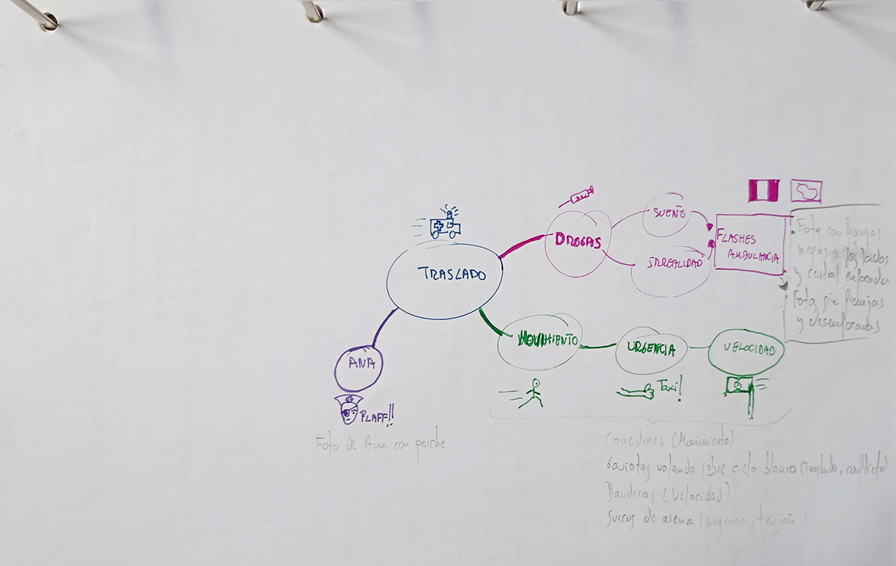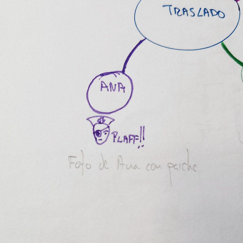 Por último, subo una ampliación de un dibujo de un mapa mental por la anécdota que contiene. Cuando en el centro de salud me pasaron a la ambulancia, Ana cogió un taxi hacia el hospital inmediatamente. El caso es que ella llegó mucho antes que yo porque estuvimos parados un rato mientras me estabilizaban.
