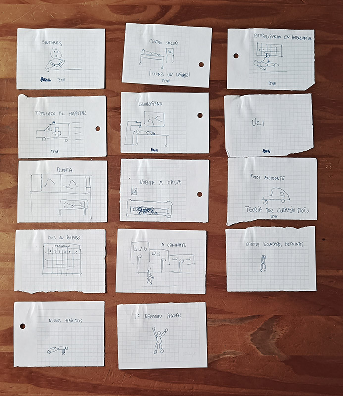 Para hacerme una idea más visual del guion me preparé unas cartulinas pequeñas a modo de storyboard con unos dibujos muy ingenuos, yo no sé dibujar, pero que me ayudaron a ir estructurando el guion. Al final no fue tan diferente.