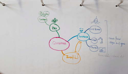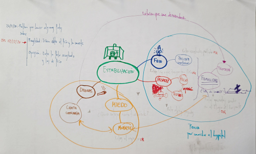 Una de las herramientas más útiles, si no la que más, fue el mapa mental. Creé una sección para cada escena donde además de ir escribiendo lo que pensaba que podría hacer, tenía una hoja central donde dibujaba un mapa mental de la escena, que básicamente es un esquema con un tronco o punto inicial a partir del cual surgen ramificaciones que son las ideas a desarrollar. La idea principal es representarlo mediante dibujos y tratar de escribir lo menos posible (se utiliza mucho en temas de estudio). Incluyo tres de ellos.